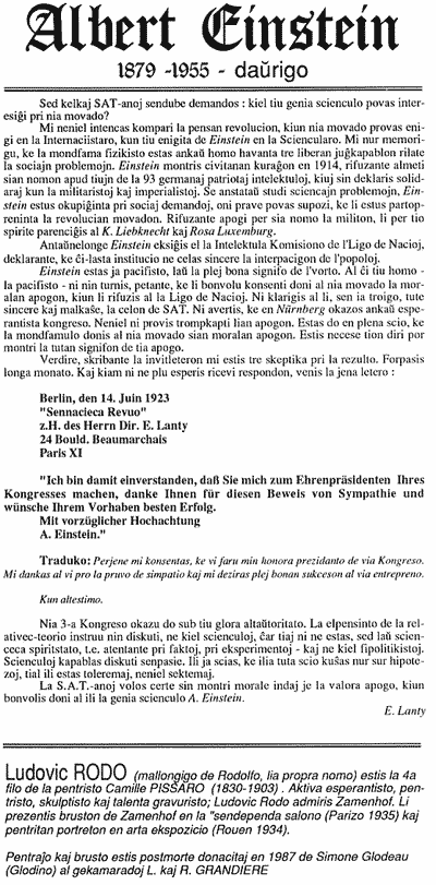 Résumé : on a attribué par erreur à Albert Einstein une citation qui était de Leopold Einstein, journaliste allemand et pionnier de l’espéranto en Allemagne. Par contre, il est certain qu’Albert Einstein, prix Nobel de Physique en 1921, avait accepté la présidence d’honneur du congrès de SAT à Cassel en 1923. Tout comme SAT, on ne peut pas dire qu’il vouait un culte au nationalisme et au militarisme...