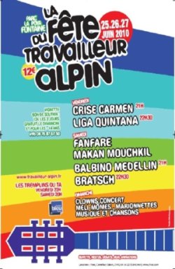 Un stand d’espéranto se tiendra dans le cadre de la Fête du Travailleur Alpin les 25, 26 et 27 Juin au Parc la Poya, rue de l’Abbé Vincent, à Fontaine (38600). Ce sera l’occasion de prendre des renseignements et de s’inscrire à l’un des cours dispensés sur l’agglomération grenobloise pour l’année scolaire 2010-2011.
