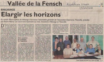 Le Républicain Lorrain publie le 29 septembre un article intitulé Elargir les horizons [1] relatant l’AG de rentrée d’Espéranto thionville et la reprise des cours.