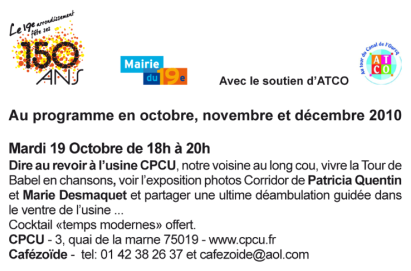 l’usine CPCU. Au programme : vivre la tour de Babel en chanson, exposition photo-corridor de Patricia Quentin et Marie Desmarquest, déambulation guidée dans le ventre de l’usine...De 18h à 20h au 34 Quai de la Marne.