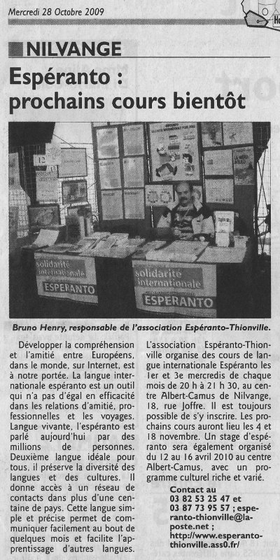 Le Républicain Lorrain du 28 octobre publie un article intitulé "Espéranto : prochains cours bientôt" dans la rubrique sur Nilvange.